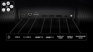 Fulde tilslutningsmuligheder giver stor kompatibilitet med andre enheder: 2x HDMI 2.1, 1x Display Port 1.4, 3x USB 3.0, 1x fuld funktion Type-C, 1x hovedtelefonstik og en praktisk udtrækkelig headsetholder.