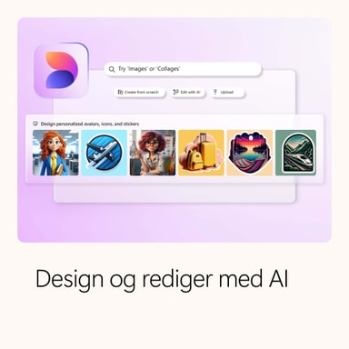 Bring dine ideer til live med kraftfulde AI-funktioner1 og værktøjer i Microsoft 365. Generer unikke design, og rediger dine billeder i Designer. Lav professionelle videoer i Clipchamp. Overvind skriveblokeringer, og del selvsikkert dine tanker med Copilot1 ved din side i Word.