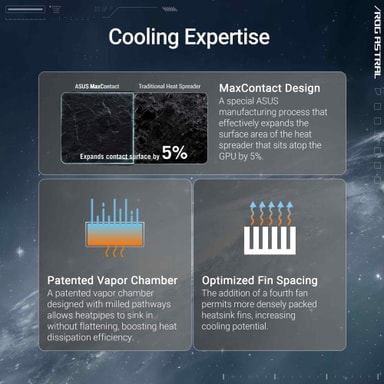 ROG Astral opgraderer kølingen med et quad-fan layout, der øger lufttrykket med 20%. Det har et patenteret vapour chamber med fræsede kanaler for at forbedre varmeoverførslen med 10%, plus en faseskifte-termisk pude, der smelter under belastning for at sikre, at GPU'en forbliver optimalt kølet.