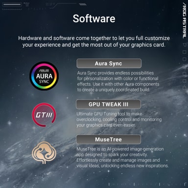 ROG Astral bruger GPU Tweak III til præcisionstuning, Power Detector+ til at overvåge kablets tilstand og MuseTree til AI-billedgenerering.