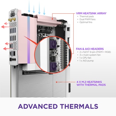 NZXT N9 X870E holder dit system køligt under pres med smart termisk design. Det har 2 NZXT 8-pin (PWM + RGB) stik, 3 systemblæser-stik og et AIO-pumpe-stik, perfekt til tilpassede køleløsninger og højtydende builds.