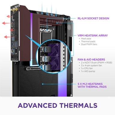 NZXT N9 Z890 holder dit system køligt under pres med smart termisk design. Det har 2 NZXT 8-pin (PWM + RGB) headers, 3 system blæser headers og en AIO pumpe header, perfekt til tilpassede køleløsninger og højtydende builds.