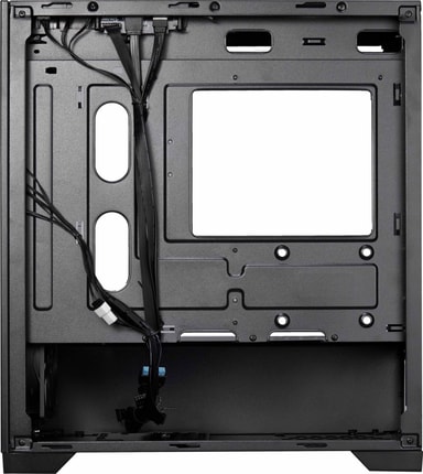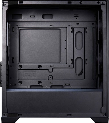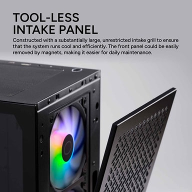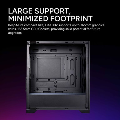 Elite 302 har et elegant, pladssparende design med et rent indvendigt layout. Det værktøjsfrie magnetiske frontpanel giver nem adgang, mens PSU-coveret holder kablerne skjult for en ryddelig samling. ARGB-belysningen tilføjer et stilfuldt præg og kombinerer moderne udseende med praktisk funktion.