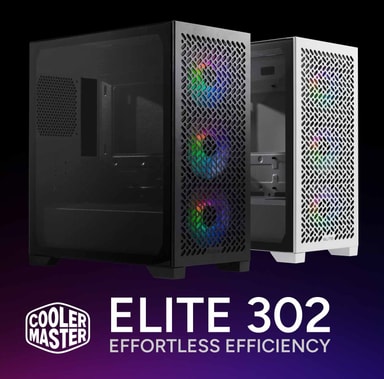 Cooler Master Elite 302 PC-kabinettet er et kompakt PC-kabinet bygget til gaming og daglig brug. Det har et stort frontgitter med tre ARGB-blæsere til effektiv køling, et rent design med PSU-cover og et værktøjsfrit magnetisk frontpanel for nem adgang. Med USB Type-C-understøttelse og god luftgennemstrømning er det en smart kombination af stil, funktion og pladseffektivitet.
