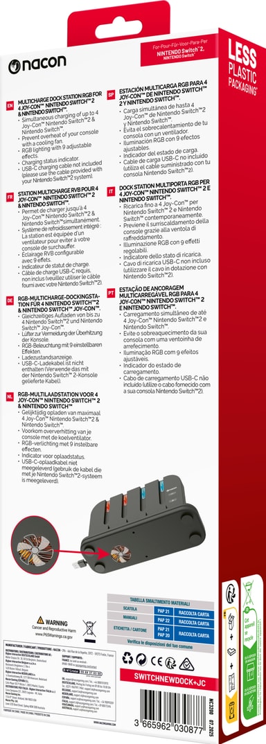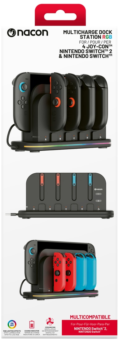 Denne Nacon Switch 2 og controller-opladningsdock giver dig mulighed for at oplade din Nintendo Switch eller Switch 2 samtidig med op til fire JoyCon-controllere. Den er udstyret med RGB-belysning, konsol-køleblæser og USB-strømtilslutning for hurtig opladning.