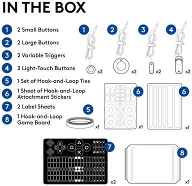 Sættet indeholder et stort udvalg af knaptyper og -størrelser: 2 letberøringsknapper, 2 små knapper, 2 store knapper og 2 triggere. Få fleksibilitet uden begrænsninger.