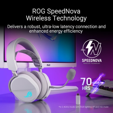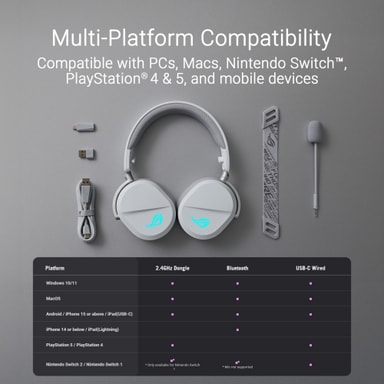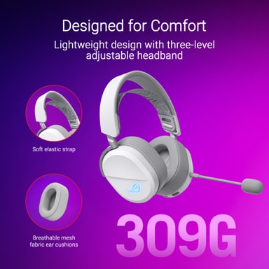 Skift mellem forskellige tilstande for den perfekte balance mellem ydeevne og fleksibilitet, takket være dette headsets tre tilslutningsmuligheder. Headsettet tilbyder alsidig forbindelse med Bluetooth for trådløs bekvemmelighed, ultra-lav latens 2,4 GHz med ROG SpeedNova-teknologi til spil uden forsinkelse, og en USB-C-kabelforbindelse for stabil lyd i høj kvalitet.