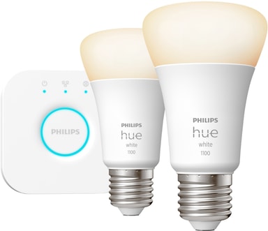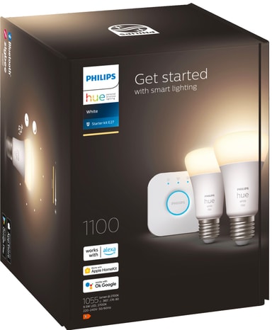 Dette Philips Hue W 9,5W A60 E27 2-pak med Philips Hue Bridge og 2 LED pærer giver alt, som du har brug for til dit første smarte lyssystem. Du kan styre hele systemet fra en smartphone-app.Læs mere om produktet
