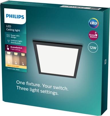 Touch-serien af loftslamper fra Philips giver masser af lys til ethvert rum i dit hjem med deres store lysflade, der sikrer en lys og ensartet lysfordeling. Takket være den integrerede SceneSwitch-funktion kan du nyde det varmhvide lys i tre lysstyrkeindstillinger: 100%, 50% eller 10%. Dette er ideelt, når du ikke allerede har en lysdæmper installeret, da du simpelthen skifter indstilling med din eksisterende kontakt. Den indbyggede hukommelseschip husker den sidste indstilling, du anvendte. Dette Philips Touch-panel har en firkantet form med sorte designdetaljer og måler 30 x 30 cm.