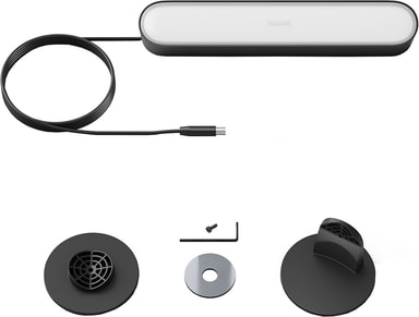 Lysbaren sælges uden strømforyning, men kan forbindes til strømforsyningen til en Hue Play lysbar, du allerede ejer. Strømforsyningen har kapacitet til op til 3 lysbarer, så pladsen omkring dit TV ikke flyder med ledninger.