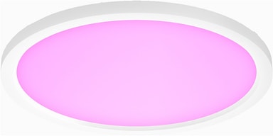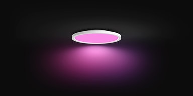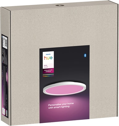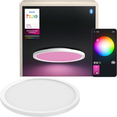 Philips Hue Surimu rundt panel tilbyder en personlig smart belysningsoplevelse med perfekt jævn belysning. Med millioner af nuancer af hvidt og farvet lys mellem 2000–6500K sikrer det jævn lysfordeling og EyeComfort for en behagelig visuel oplevelse. Kombiner det med en Hue Bridge for at låse op for forskellige lyseffekter og fuld smart funktionalitet.