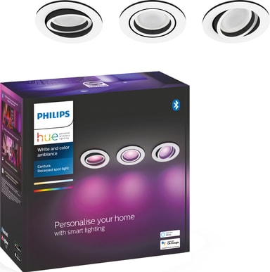 Dette forsænkede Philips Hue Centura spotlys 3x5,7W har den rigtige farve til enhver lejlighed. Leg med forskellige farver og intensiteter, og betjen lysene via Hue Bluetooth-appen eller Hue Bridge for at få endnu flere muligheder.Læs mere om produktet