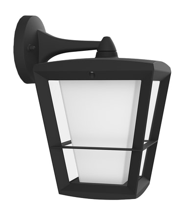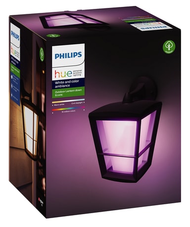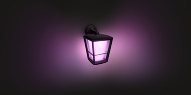 Med Philips Hue Econic White and Color Ambiance væglanternen kan du lyse på omkring dit hjem med et udvalg på 16 millioner farver. Lampen er vejrsikret og kan dele samme Philips Hue Bridge som resten af belysningen i dit hjem. Du kan tænde og slukke lanternen, dæmpe den og styre den fra din telefon eller tablet.