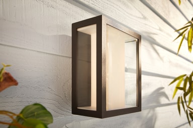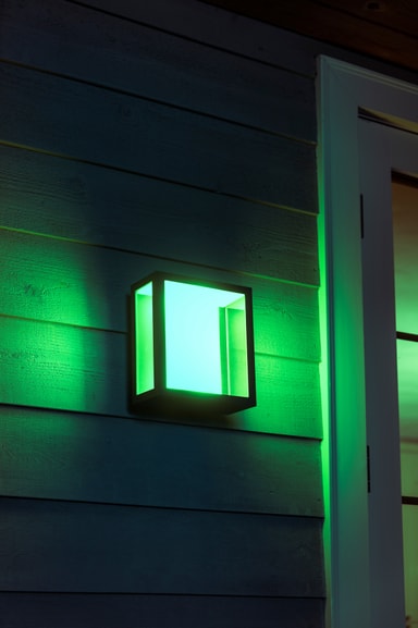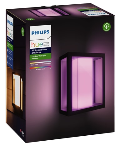 Den vejrbestandige Philips Hue Impress White and Color Ambiance væglanterne giver dig ekstra tid til at nyde din have eller terrassen til det yderste. Vælg en hvilken som helst farve, sæt timeren og betjen nemt lamperne via din smartphone.