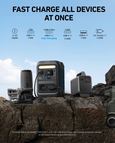 Denne strøm station har en 288Wh, omkring 90.000mAh kapacitet og op til 300W output. Med 7 udgange, herunder en 140W USB-C PD-port, holder den alle vigtige enheder opladet på farten, hvad enten det er til camping eller som strømbackup.