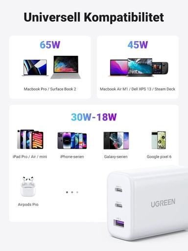 Dette produkt er perfekt til dig, der rejser meget. Den har 2xUSB-C og 1xUSB-A porte på 65W og er meget lille og har et stilfuldt design.