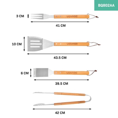 Saftige burgere, velsmagende grøntsager og perfekt grillede bøffer: Med grillsættet fra VONROC tilbereder du altid den perfekte ret! Grillredskaberne er udstyret med stilfulde bambushåndtag og slidstærkt rustfrit stål, som gør dem perfekt vandafvisende og nemme at rengøre. Takket være den store længde (± 40 cm) kan du arbejde komfortabelt og i sikker afstand fra den varme grill.
