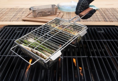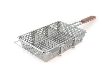 3 delt grillkurv med låsemekanisme og træ håndtag der gør det muligt at grille et helt måltid på en gang. Forskellig grilltid betyder intet for hver af de tre kurve kan indsættes eller tages ud individuelt og er lette at tage fra grill til bord.