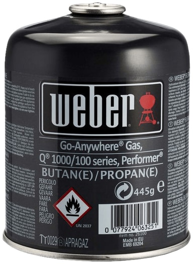 MedWebers gasbeholderen WEB17846 med butan/propankan du tænde op i din grill, uanset hvor du er. Uanset om du har venner på besøg i din baghave eller camperer under en biltur, vil denne beholder give den gnist, din grill har brug for i omkring tre timer. Beholderen er kompatibel med følgende Weber produkter: Q100/Q1000-serien, Traveler, Performer Deluxe GBS, Go-Anywhere og Summit-kulgrillene.