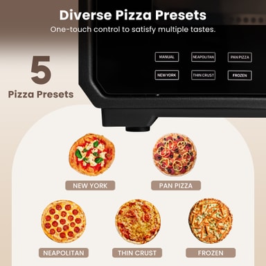 Bag alt fra panpizzaer til tynde bunde, New York-stil til napolitanske pizzaer. Med seks indstillinger at vælge imellem kan du endda optø en frossen pizza.