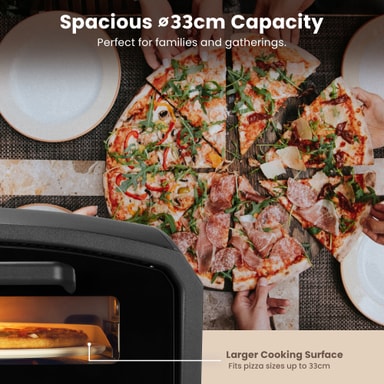 Den 33 cm roterende pizzasten opvarmes jævnt og sikrer ensartet tilberedning. Denne rotation giver en sprød skorpe, mens dine toppings forbliver saftige, hvilket skaber en perfekt balance i teksturerne.