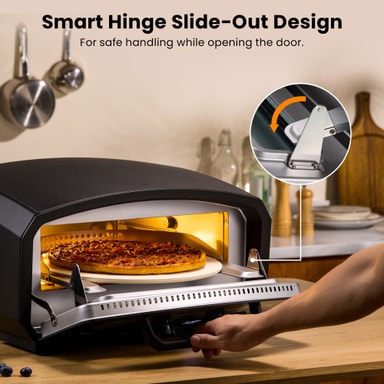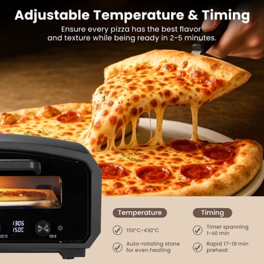 Pizzaovnen opvarmes til 430°C og har en justerbar termostat, der understøtter et temperaturområde på 150-430°C.