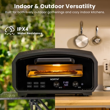Den 2100-watt North pizzaovn 205006 har en 33 cm roterende sten for jævn tilberedning og en kompakt grilloverflade på ca. 54 x 39 cm. Med et temperaturområde på 150-430°C, LED-display og IPX-godkendelse er den perfekt til både indendørs og udendørs brug.