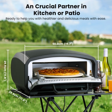 Pizzaovnen har et lille grillareal på ca. 54 x 39 cm, ideelt til alle pizzastile og toppings. Dens IPX-godkendte design fungerer både indendørs og udendørs, hvilket gør den perfekt til udendørs madlavning og grillfester.