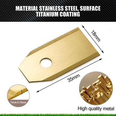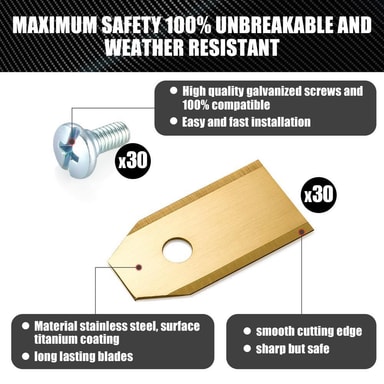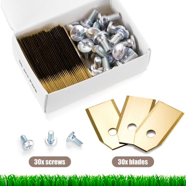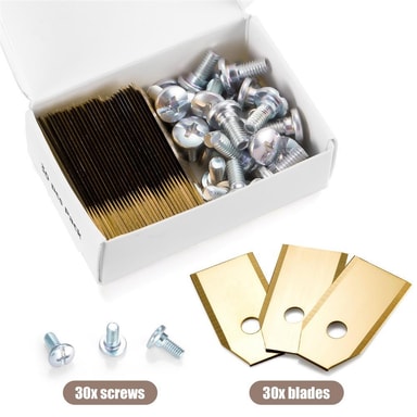 Pakke med 30 knive med skruer i rustfrit stål til robotplæneklippere, der er kompatible med 105, 310, 315, 320/420/430x, R40I Vores sæt med 30 titaniumknive er det rigtige valg for alle, der sætter pris på en velplejet græsplæne til enhver tid! De udvalgte materialer (rustfrit stål og titanium) garanterer perfekte klipperesultater. De er vejrbestandige, rustbestandige, slidstærke og særligt skarpe. Knivene er meget nemme at fastgøre til robotten med de medfølgende skruer- Pakke med 30 knive og skruer- Rustfrit stål af høj kvalitet med titaniumbelægning- Kun 0,75 mm tynde- Dobbeltsidede og ekstra skarpe Takket være disse knivskarpe knive kan du nyde en rent klippet græsplæne hver gang!
