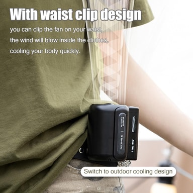 Lille genopladelig køleventilator, som du kan sætte på tøjet eller dit bælte. Ventilatoren blæser kold luft på din krop og under dit tøj, og køler din krop hurtigt ned. Ventilatoren har en stærk motor, der kan justeres i 3 hastigheder.