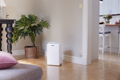 Den kompakte og bærbare affugter er designet til at blive placeret på gulvet. Affugteren anbefales til små og mellemstore rum på op til 40 m2. Den leveres med en 2-liters vandtank og en drænvandsbeholder.