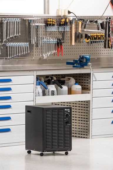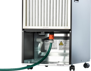 Affugteren er designet specifikt til at affugte kældre. Den er let at flytte rudt takket være håndtaget, og du kan enten bruge 11,4 l vandtanken eller forbinde den til direkte afløb.