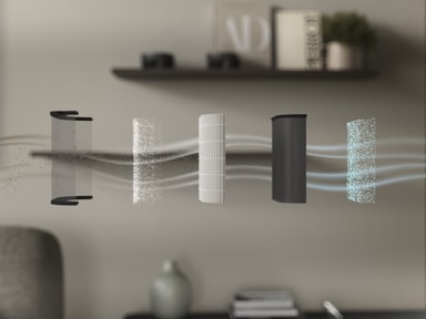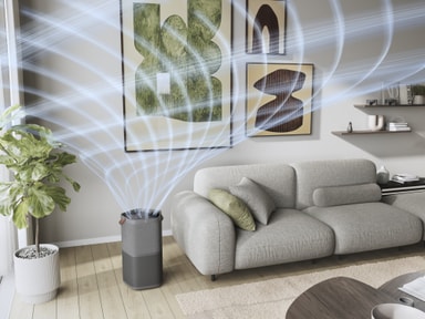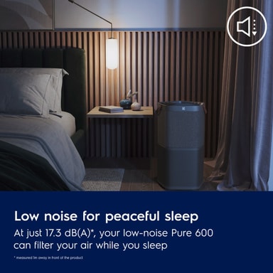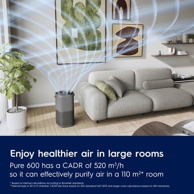 Perfekt til større områder: Med en CADR på 5201 renser Pure 600 luften i et rum på 108 m22 på under 4,24 minutter3, takket være det effektive AirSurround systems spiralformede luftstrøm. Et aktivt kulfilter neutraliserer formaldehyd og andre flygtige organiske forbindelser.
