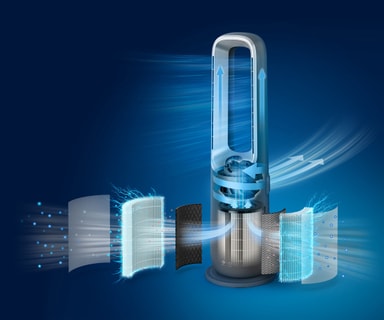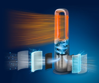 Luftrenseren fungerer også som ventilator og varmeapparat. Det bladløse design fordeler luften jævnt i hele rummet og giver en ensartet strøm af frisk luft.