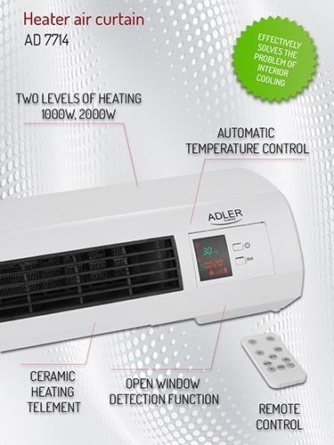 Luftridå AD 7714 har en kapacitet på 2200W som löser effektivt problemet med inre kylning på grund av ofta öppnande av dörrar, vilket är särskilt användbart i butiker, offentliga byggnader, restauranger och institutioner. Genom att värma luften från utsidan vid ingången är kostnaderna för att värma insidan begränsade. Luftridån ger möjlighet att ställa in veckodagar och arbetstimmar samt blåsa utan värme. Enheten är utrustad med en funktion som gör att den märker om ett fönster står öppet (när temperaturen i rummet sjunker med 10 ° C stänger enheten av automatiskt värmen). Produkten har en automatisk temperaturkontrollfunktion, enheten slås på och av för att upprätthålla den inställda temperaturnivån. Det styrs enkelt av en fjärrkontroll.