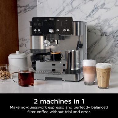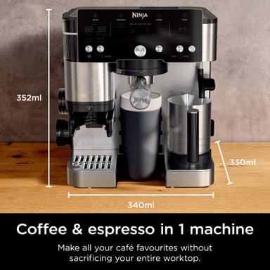 Ninja Luxe Cafe Essential espressomaskinen ES501EU er en 2-i-1 espresso- og filterkaffemaskine, der brygger baristakaffe derhjemme. Den har en indbygget kværn med 25 indstillinger, automatiske justeringer af maling og brygning samt tilpasningsmuligheder for drikkestørrelse, styrke og skum. Med 7 drikkestørrelser og et Dual Froth-system til både mælk og plantebaserede alternativer kombinerer den brugervenlighed og bekvemmelighed.