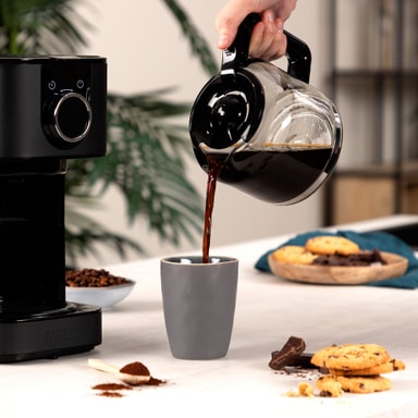 Kaffemaskinen fra Princess leveres med en glaskande med en kapacitet på 1,5 liter.