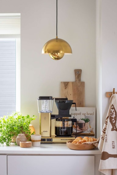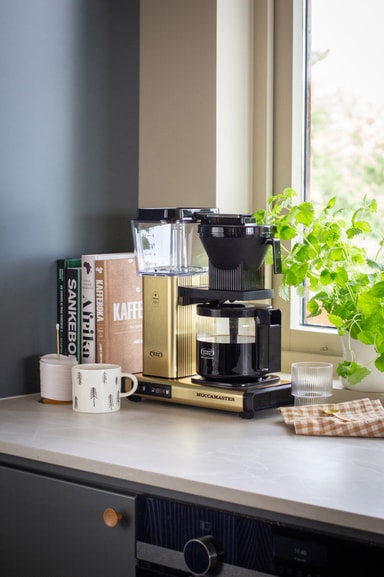 Moccamaster Optio har et enkelt design fremstillet af holdbare materialer i høj kvalitet. Den smukke guldfarve giver den et personligt og stilfuldt udtryk
