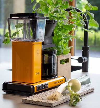 Moccamaster Optio har et enkelt design fremstillet af holdbare materialer af høj kvalitet. Den gule farve giver den et personligt og stilfuldt udtryk