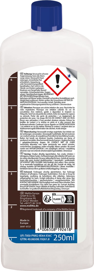 Slap af kalk i din kaffemaskine eller elkedel nemt med Melitta afkalkningsvæsken 96056 lavet af 100% citronsyre. Hver rengøring kræver 40ml af midlet, blandet med 500ml vand.Læs mere om produktet