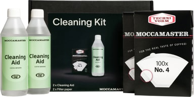 Moccamaster rengøringssæt sikrer konsistent kvalitetskaffe med to lugtfri Cleaning Aid flasker, der fjerner kaffeolier, plus 200 stk. No. 4 dobbeltsvejsede filtre til perfekt brygning i din professionelle Moccamaster eller andre maskiner.Læs mere om produktet