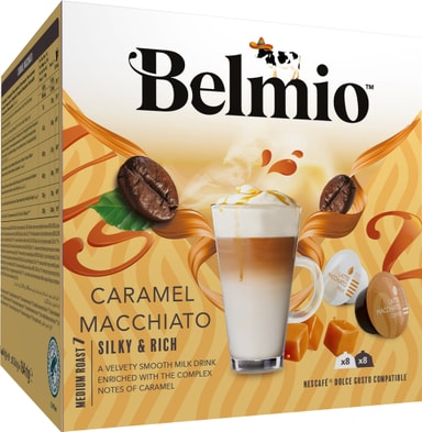 Belmio Caramel Macchiato kaffeekapsler til Dolce Gusto blander premium Arabica og Robusta kaffe med cremet, karamelsmag mælk. Perfekt til en sød start på dagen eller en afslappende eftermiddagspause. Indeholder 16 kapsler (8 kaffe + 8 mælk), kompatible med Dolce Gusto-maskiner.