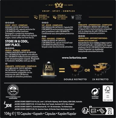 Den fine sammensætning af L'OR Barista Double Ristretto intensitet 11 kaffekapslernegiver dig en lækker kaffe beriget med krydrede noter af ingefær og kardemomme. XXL kapslerne er designet til brug med L'OR Barista kaffemaskinen, og hver kapsel giver dig mulighed for at tilberede enten en dobbelt Ristretto eller to kopper Ristretto på samme tid.
