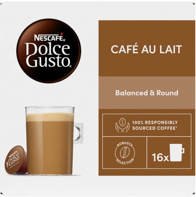 Oplev NESCAFÉ Dolce Gusto Café au Lait kaffekapsler, en afbalanceret kombination af intens kaffe og blød mælk i én kapsel. Vores Café au Lait kaffe er mellemristet og perfekt afbalanceret til din ideelle morgenkaffe. Det er en intens, ristet blanding med subtile kornnoter, alt sammen toppet med et lækkert skumtæppe, der gør vores Café au Laits overbærende signatur. Hemmeligheden bag en kvalitets Café Au Lait er råvarer af højeste kvalitet. Derfor bruger vi glat sødmælk og dristige Robusta kaffebønner. Takket være vores Grown Respectfully-program hjælper vi landmænd og deres samfund ansvarligt at dyrke disse kvalitetskaffebønner, og sikrer dem en rimelig indkomst, mens vi respekterer planeten.​ Ingredienser: sødmælkspulver (80,2%), opløselig kaffe (17,3%), stabilisatorer ( kaliumphosphater og natriumcitrater), smørolie (fra mælk).