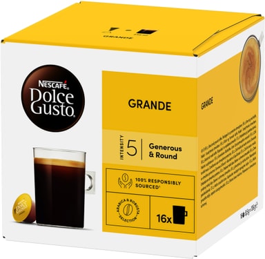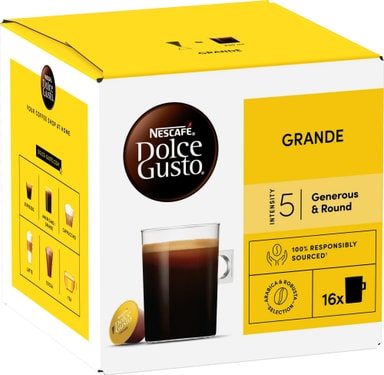 Fyldt med den glatte smag af mellemristede 100 % Arabica-kaffebønner er vores NESCAFÉ Dolce Gusto Grande-kaffekapsler en ideel Americano, der kan serveres med eller uden mælk.Læs mere om produktet