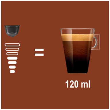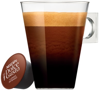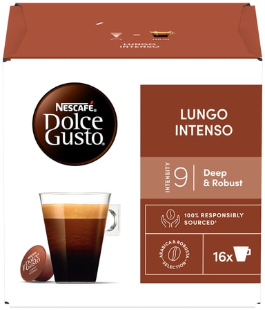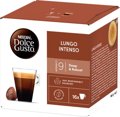 Stærk ogstor -- findes der en bedre kombination, når det kommer til velsmagende kaffe? Tag dig et øjeblik når som helst på dagen og nyd vores Lungo Intenso-kapsler. I stedet for at lave en espresso-shot ledes der nok varmt vand til at fylde en almindelig kaffekop gennem den ristede og malede kaffe. Resultatet: en rig og glat autentisk italiensk kaffekapsel, som du kan tage din tid over. Ingredienser: Kværnet ristet arabica og robusta kaffe. Denne pakke indeholder 16 kapsler NESCAFÉ Dolce Gusto Lungo Intenso-kapsler og det er Dolce Gusto-maskinkompatible kapsler. Ingredienser: Kaffe (100%).