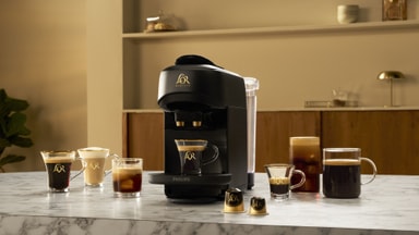 L’Or Absolu kapselmaskine på køkkenbord omgivet af kaffekopper
