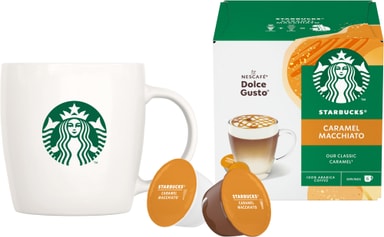Pakken kommer med Genio S Plus kapselmaskinen og 1 kasse dekadent Caramel Macchiato og en gratis gave i form af den ikoniske Starbucks kop (260 ml).