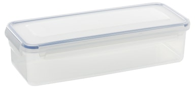 Opbevaringsboks rektangulær m/låg 1,7 liter. Funktion. Mål: 300 x 118 x 72 mm. Lufttæt opbevaringsboks med 4 klips og gummikant. Kan anvendes i mikroovn. Åben altid låget ved brug i mikroovn. Tåler frost. Tåler maskinopvask.
