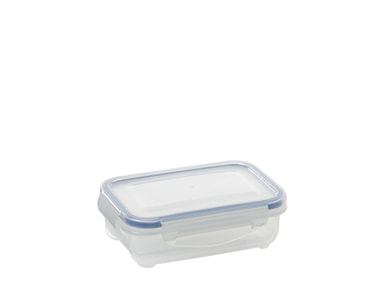 Opbevaringsboks rektangulær m/låg 310 ml. Mål: 142 x 99 x 42 mm. Funktion. Lufttæt opbevaringsboks med 4 klips og gummikant. Kan anvendes i mikroovn. Åben altid låget ved brug i mikroovn. Tåler frost. Tåler maskinopvask.